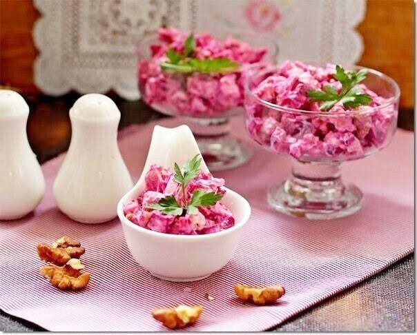 - Нарезать кубиком свеклу и куриную грудку. Орехи порубить.