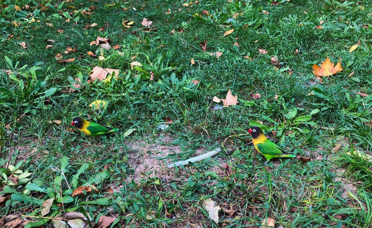 Обычно эти попугайчики 🦜, бурно что-то осуждают на деревьях нашего парка 🌳. Этот вид попугайчиков, называют - Масковый Неразлучник.