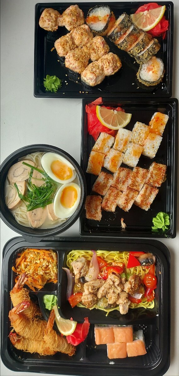 В сете: роллы «Нирвана», «Сансет», «Тамаго сан», запечённый ролл «Блэк бэлт».