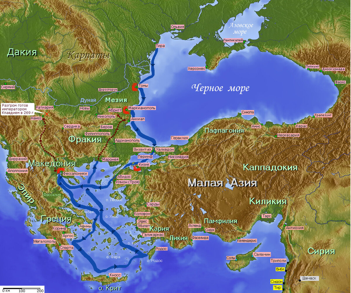 Тут стоит напомнить, что, придя откуда-то с территории нынешней Польши, эти варвары обосновались в Северном Причерноморье. А данный район на протяжении многих веков облюбовали для своих колоний те же греки. Вот их-то варвары и заставили понастроить целую флотилию кораблей. Ну и начались «походы за зипунами». Поначалу в акватории Чёрного моря, где из-за раздолбайства гарнизона племена боранов ухитрились взять такой укреплённый город, как Трапезунт.