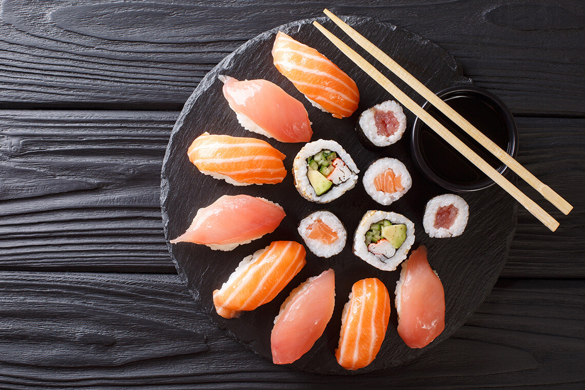 Основа суши – это белый мелкозернистый рис. Его варят в закрытой ёмкости с минимальным количеством воды, затем смешивают со специальным соусом сумэси: рисовый уксус, сахар, соль. Классическая начинка – сырая рыба, но суши с ней подадут, скорее всего, только в Японии, где нет проблем с поставкой свежайших морепродуктов. В европейских странах будут использовать обработанную рыбу, чтобы снизить риск отравления и заражения паразитами. Обычно на комочке риса оказываются куски лосося, тунца, угря и желтохвоста. Часто используют морепродукты, которые сочетаются с рисом (кальмар, осьминог, креветки, морские гребешки, икра); маринованные овощи; японский омлет из яиц и специального майонез; авокадо. Иногда начинку фиксируют с помощью нори – сушёных листьев водорослей, которые раньше соскребали со дна рыбацких лодок, а теперь выращивают на специальных фермах.
