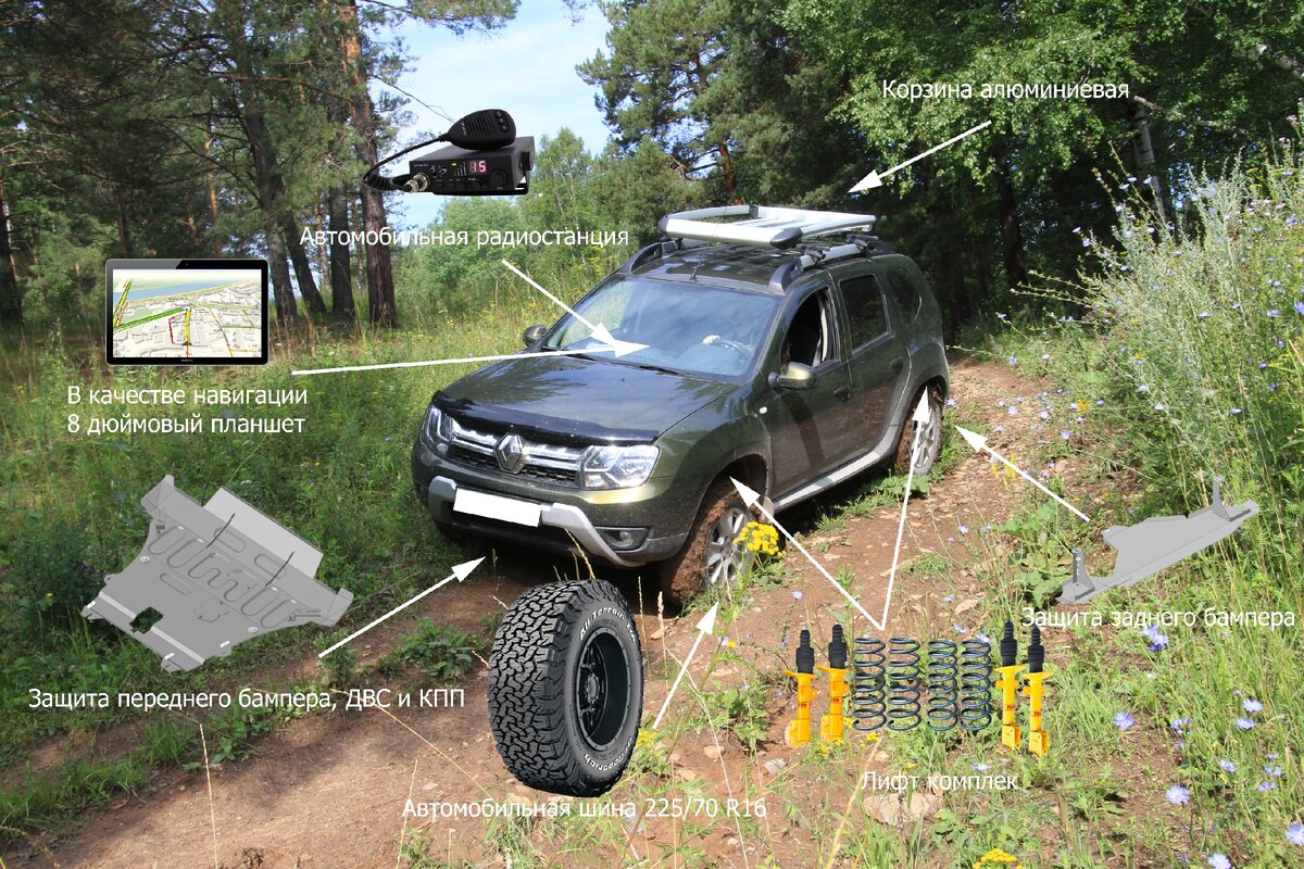Мой дизельный Дастер по истечению срока гарантии прошел некоторые доработки. Так как я автопутешественник и люблю красивые места, а до некоторых добираться приходится не только по асфальту, но и по бездорожью. Вот отсюда подробно и начну, вот именно со съезда на бездорожье и начался мой тюнинг. В принципе Дастер и в стоке хорош, но всегда хочется еще лучше, больше и выше. В лесах стал замечать, что мне стандартного клиренса недостаточно, частенько задеваешь и чиркаешь. Размышлял, размышлял что мне сделать и выбрал свою золотую середину. Было решено увеличить дорожный просвет с помощью лифт комплекта состоящего из амортизаторов и пружин, а также заменой шин с размера 215х65 Р16 на 225х70 Р16 .