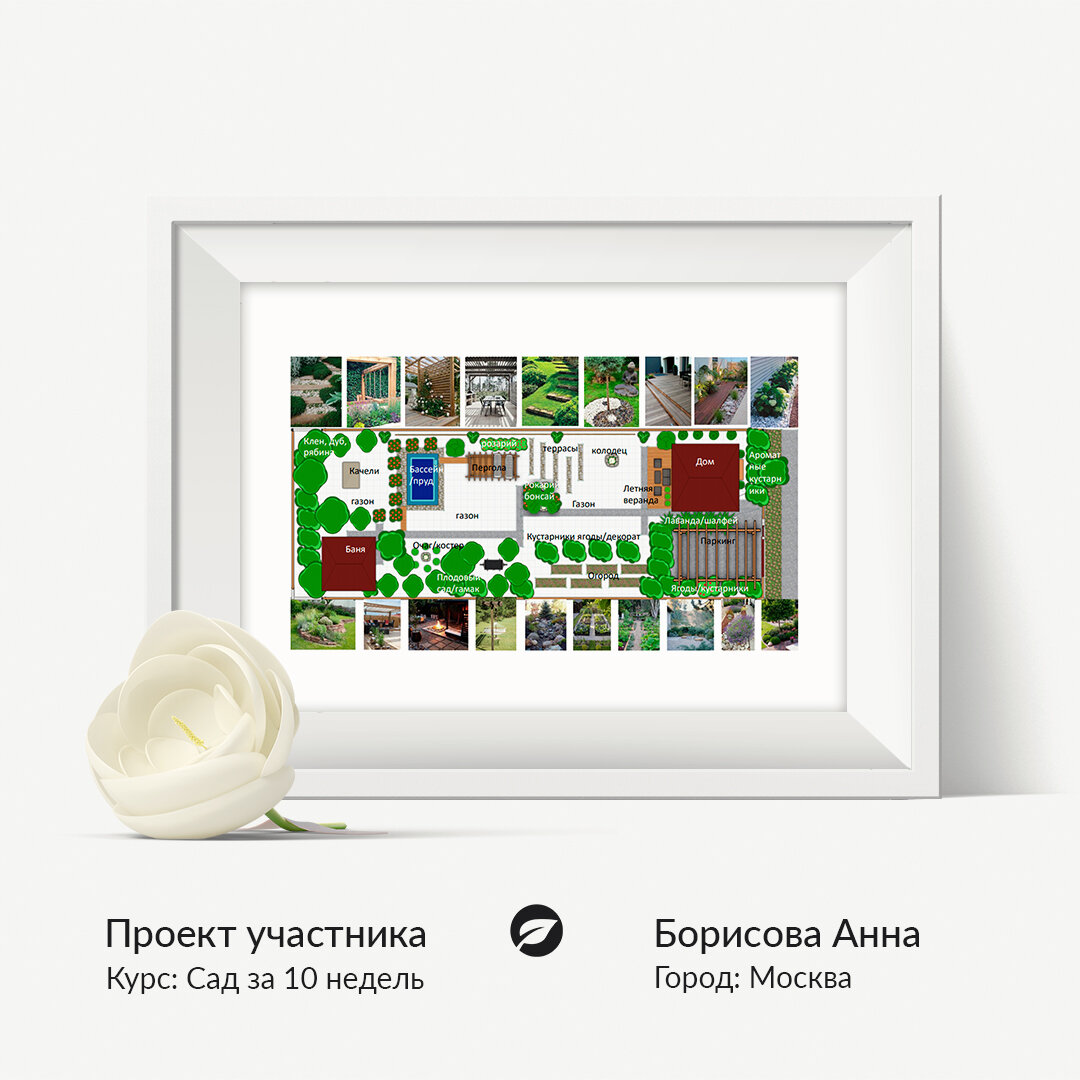 При создании темы и концепции сада, я вдохновлялась восточной культурой, которая привлекает меня стихиями. Они будут раскрываться в проекте следующим образом: камень — бетон и щебень, вода — небольшой пруд, огонь — очаг, земля — деревья, цветы и растения, и воздух — пространство для свободного течения энергии. Планирую создать уютное место для релакса, медитации и гармонии, место, где время останавливается.