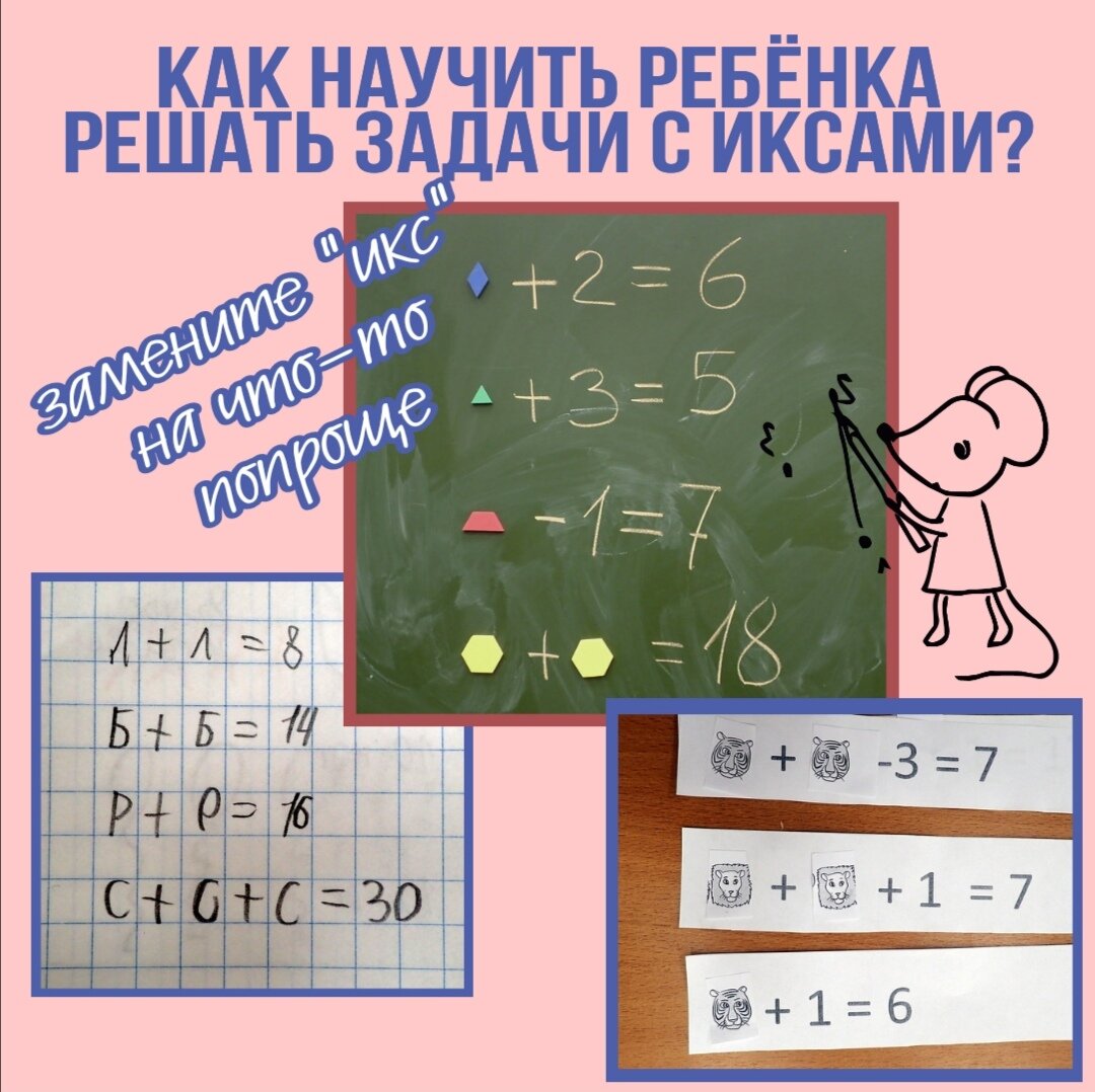 В первую очередь, надо понимать, что "икс" — это страшно умное слово, которое сразу включает для ребёнка красный цвет: дальше сложно, где сложно, там скучно, и никаких задачек уже не хочется и не можется.