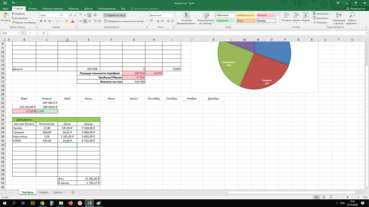 Инвестировано в акции 400 000 р. 4 компании Лукойл, Газпром, НЛМК, Норникель. Годовой доход от дивидендов компаний 33 482 р. или 2 790 р.\ месяц