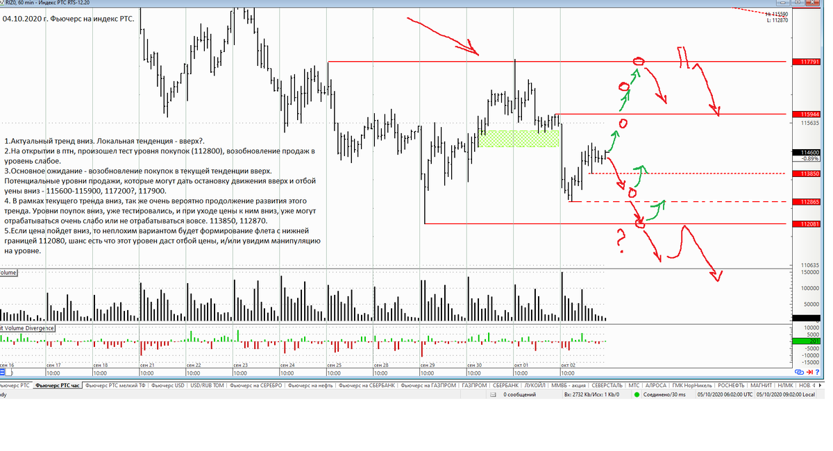 Здравствуйте друзья. Начинаем новую торговую неделю. На прошлой торговой неделе, у нас на рынке появились признаки окончания текущего тренда вниз, в котором мы находимся уже полтора месяца. Хотелось бы уже и порасти, всё время падать уже как то поднадоело. Но, признаки разворота, признаками, а тренд у нас пока вниз, поэтому в целом, от уровней продаж будем искать точки входа на продолжение движения вниз. локальная тенденция в пятницу на рынке пошла вверх, можно ожидать и сегодняшнего открытия вверх, в продолжение её. Тем более за выходные негативных новостей не было и мир торгуется относительно позитивно сейчас. Если открываемся вверх, то ждём цену на уровнях продаж, смотрим как они будут отрабатываться, и будем пробовать отрабатывать возобновление продаж от уровней. Уровни продаж сейчас я вижу на - 115600-115900, 117200?, 117900.