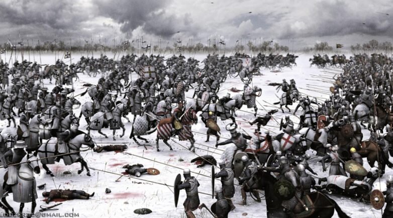 Русь, ослабленная монголо-татарским игом, оказалась в очень тяжелом положении, когда над ее северо-западными землями нависла угроза со стороны шведских и немецких феодалов. После захвата прибалтийских земель рыцари Ливонского ордена приблизились к границам Новгородско-Псковской земли. В 1240 г. состоялась Невская битва — сражение между русскими и шведскими войсками на реке Неве. Новгородский