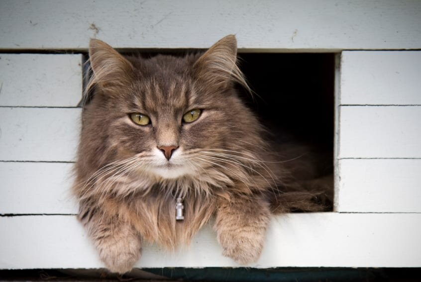 Стала ли дверца проблемой для кошек? Совершенно нет! Она вызвала здоровый интерес, кошки тут же полезли в лаз. Они любопытны и всегда любят сунуть нос в коробку, в окошко или дверцу.
