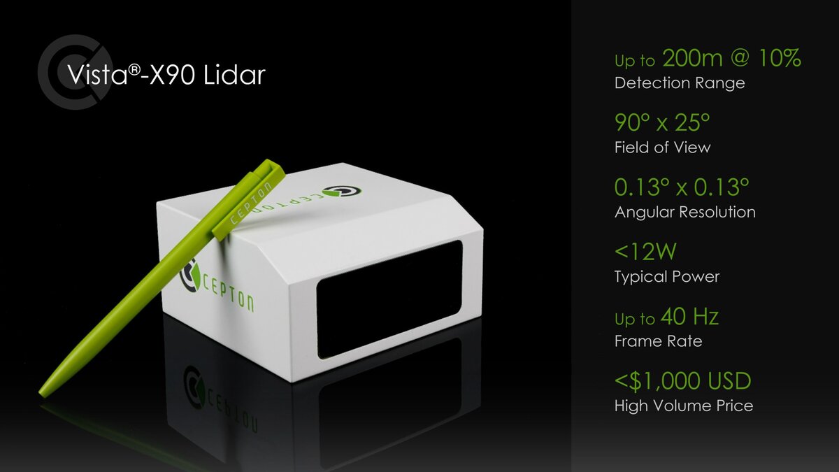 Компания Cepton Technologies, поставщик решений LiDAR, представила подробную информацию о своем автомобильном датчике LiDAR Vista®-X90, который обеспечивает повышенную производительность при большой цене менее 1000 долларов. Производство запланировано на 2022 год.