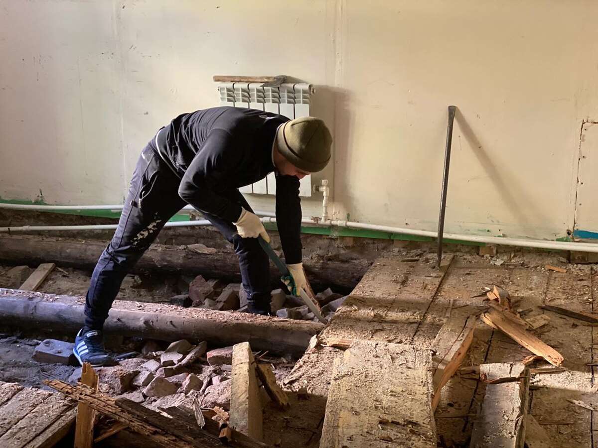 Специалисты приступили к демонтажу прогнивших деревянных полов. Проект ремонтно-реставрационных работ предусматривает выполнить большой объем задач. Аварийное здание приведут в нормативное состояние.