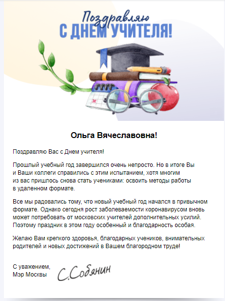 Прошлый учебный год завершился очень непросто. Но в итоге Вы и Ваши коллеги справились с этим испытанием, хотя многим из вас пришлось снова стать учениками: освоить методы работы в удаленном формате. Все мы радовались тому, что новый учебный год начался в привычном формате. Однако сегодня рост заболеваемости коронавирусом вновь может потребовать от московских учителей дополнительных усилий. Поэтому праздник в этом году особенный и благодарность особая. Желаю Вам крепкого здоровья, благодарных учеников, внимательных родителей и новых достижений в Вашем благородном труде!