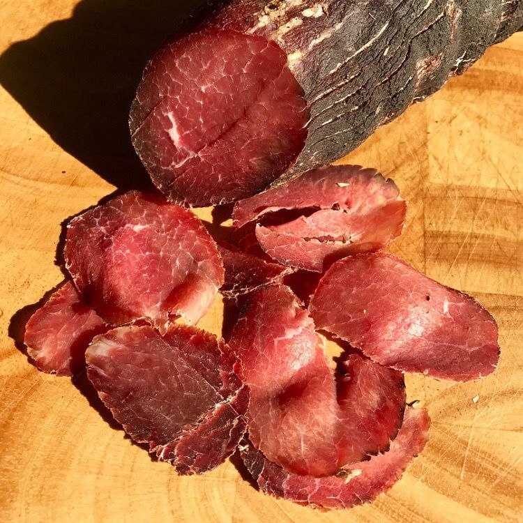 Брезаола — соленая вяленная говядина, твердая, имеет темно красный цвет.