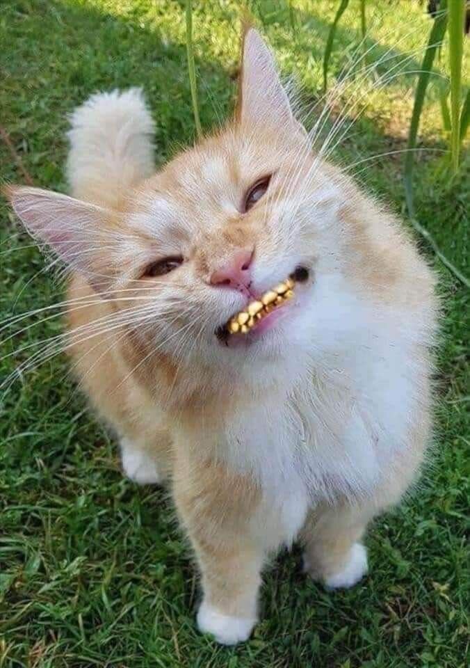 Кот с золотыми зубами. Американский стоматолог Дэвид Стил из Индианы поставил своему годовалому очаровательному персу золотые коронки на клыки и тем самым прославил его на весь мир. Получился необычный кот !