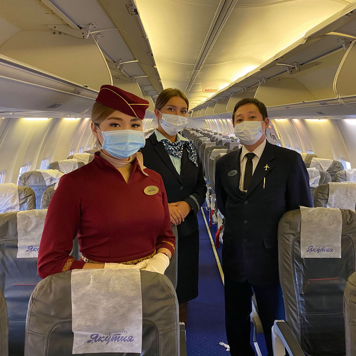На входе в самолет, как водится, сначала «ковидные» процедуры. Проверка температуры и обработка рук антисептиком. А потом попадаешь в такую «мини-сказку» по-якутски. Пока что такой «бизнес» у авиакомпании установлен только на двух самолетах, но вскоре к ним прибавятся еще два «сказочных» воздушных судна.