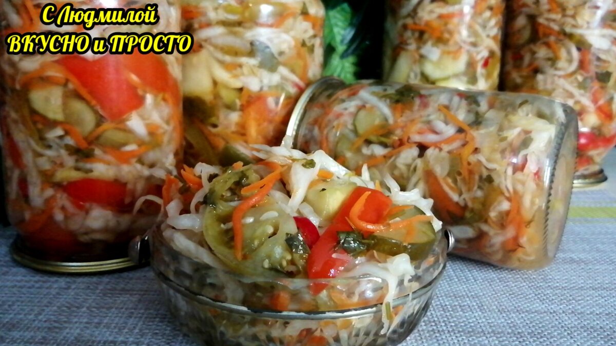 В этот салат можно положить практически все овощи, какие ещё остались у вас в огороде: зелёные помидоры, огурец, кабачок, капусту, морковь, лук... Поэтому делаю его уже в конце "сезона заготовок на зиму". Получается очень вкусное, да к тому же, красивое овощное ассорти. Главное в этом салате - не переварить овощи, тогда они получаются как свежие маринованные. Ну и делать этот салат просто - нарезал всё соломкой, добавил что нужно для маринада, простерилизовал и готово! Зелёные помидоры, огурцы, лук, кабачки режем полукольцами, толщиной 3 - 4 мм. Капусту и болгарский перец режем соломкой. Морковь трём на корейской тёрке.
