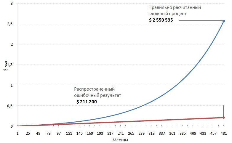 Предположим, что инвестор ежемесячно вносит на счет $400 под 10% годовых. Какая сумма окажется на его счете через 40 лет? Большинство людей при быстром подсчете мыслили так: $400 в месяц × 12 месяцев × 40 лет × (1+10%) и получали итоговую сумму около $200 000. Реальная величина составляет $2,5 млн, то есть в 10 раз больше, чем при линейном мышлении!