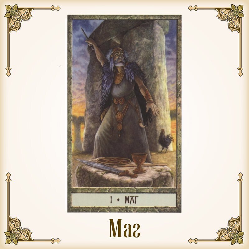Изображённые на столе у Мага 4 предмета - есть 4 качества, которые дают возможность иметь власть над всем тем, что касается человеческой жизни.