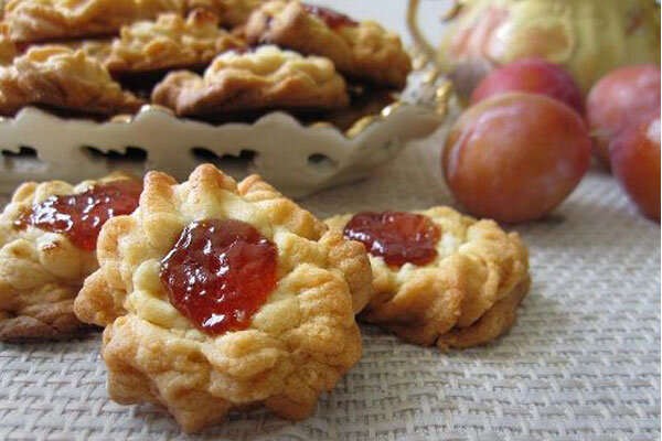 Противень смажьте маслом или используйте специальную бумагу для запекания. Выложите на него лимонное печенье и выпекаем в хорошо разогретой духовке в течение 30 мин до светло-коричневого цвета. Образовавшиеся углубления в готовом печенье снова заполните фруктовым повидлом, украсьте сахарной пудрой.