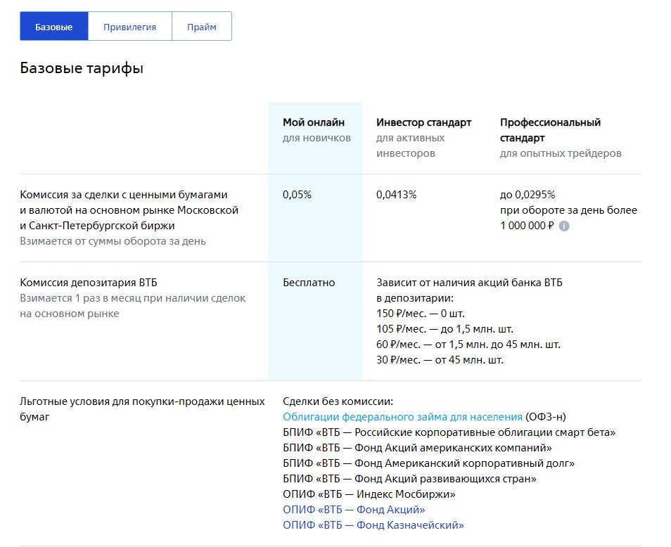 Стоит учесть, что в рамках ВТБ имеется плата за депозитарий, и составляет до 150 рублей ежемесячно. А если инвестор приобретает на счёт акции банка ВТБ, то тариф снижается до 105 рублей ежемесячно. В том случае, если никаких операций не совершалось, то в таком случае комиссия не взымается.