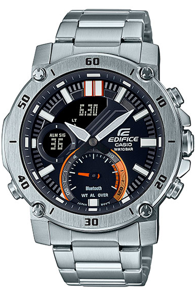 Мужские кварцевые часы Casio ECB-20D-1A коллекции Edifice с технологией Bluetooth. Калибр механизма — 5638. С помощью Bluetooth вы можете подключить часы к смартфону и получить доступ к полезным функциям. Часы автоматически связываются с телефоном через Bluetooth и проверяют точность времени 4 раза в сутки. Возможности Bluetooth в данной модели: С помощью специального приложения EDIFICE Connected возможно установить время в конкретном городе (300 городов), установить точное текущее время, установить будильник, просмотреть показания секундомера, подстроить положение стрелок, таймер встреч (соответствует встроенному в ОС телефона календарю и календарю Google). Функция поиска телефона, можно включить тоновый сигнал на телефоне, что позволит быстро найти телефон. Функциональность данной модели: индикация даты и дня недели (на Русском языке); вечный календарь до 2099 года; 5 независимых будильников и сигнал начала часа; секундомер с измерением до 23 часов 59 минут 59 cек. и записью результатов (200 записей); таймер обратного отсчёта (диапазон времени 24 часа); функция выключения звука кнопок (Mute); оповещение о низком уровне заряда элемента питания. Стрелки и метки покрыты люминесцентным напылением (светятся в темноте), полностью автоматическая диодная подсветка циферблата (включается при недостаточном освещении и при наклоне часов на 40°). Водонепроницаемость WR100 (10 атм).