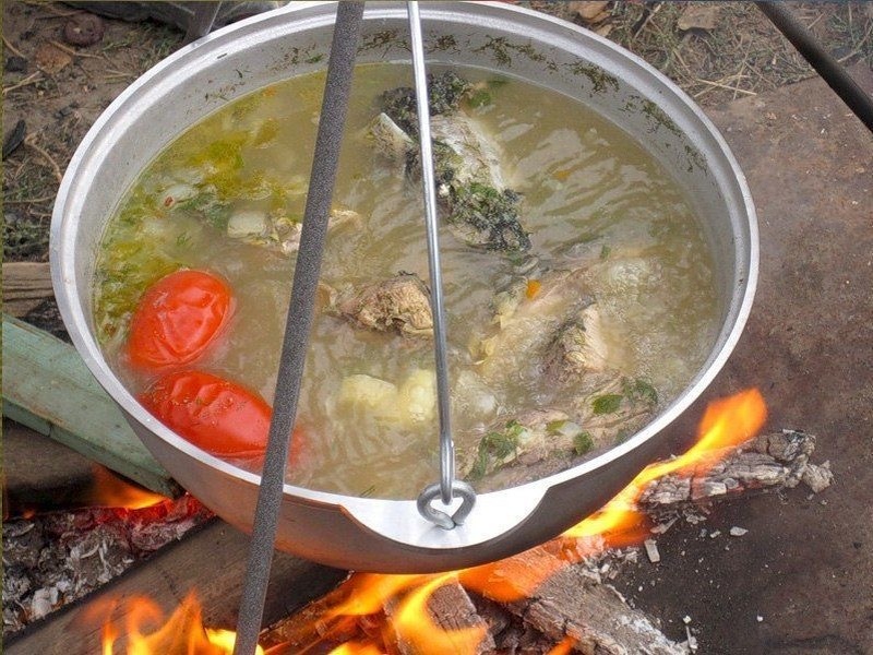 После того, как уха готова, её надо снять с костра, накрыть крышкой и дать постоять рядом с углями минут 10. И только потом разливать по тарелкам.