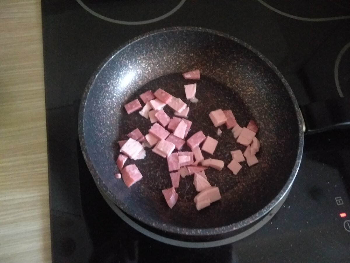 Начнем готовку с обжаривания колбасы. Думаю она найдется у многих в холодильнике. Поскольку я не смог определиться с видом то взял обе.