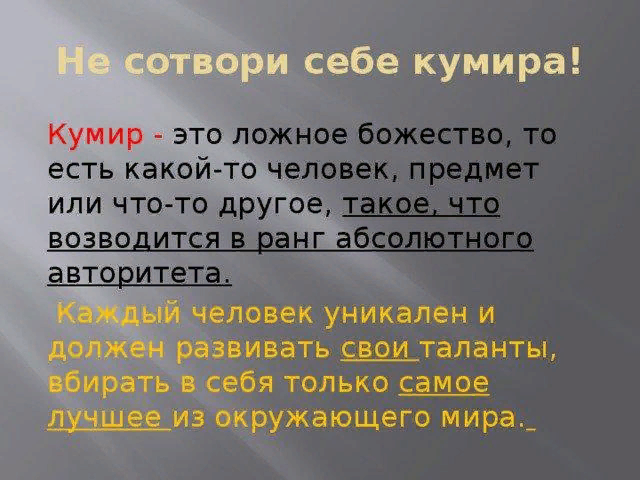 Это библейское изречение сейчас злободневно как никогда. Более 2000 лет это изречение говорит:,, Люди, не творите себе кумиров". Люди не обращают на него внимание и действуют прямолинейно с точностью наоборот. Они постоянно творят себе кумиров, идолов, богов, пытаясь походить на них во всём. Более 2000 лет люди упрямо или кому-то назло создают себе кумиров и боготворят их.