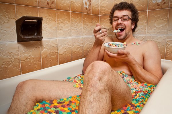Ну как вам такой вариант сухого завтрака? Совмещаем приятное с полезным: моемся и принимаем пищу. Честно говоря, я очень люблю различные вкусные хлопья, каши, но вот скорее всего после просмотра этой фотографии колечки я кушать уже не смогу.