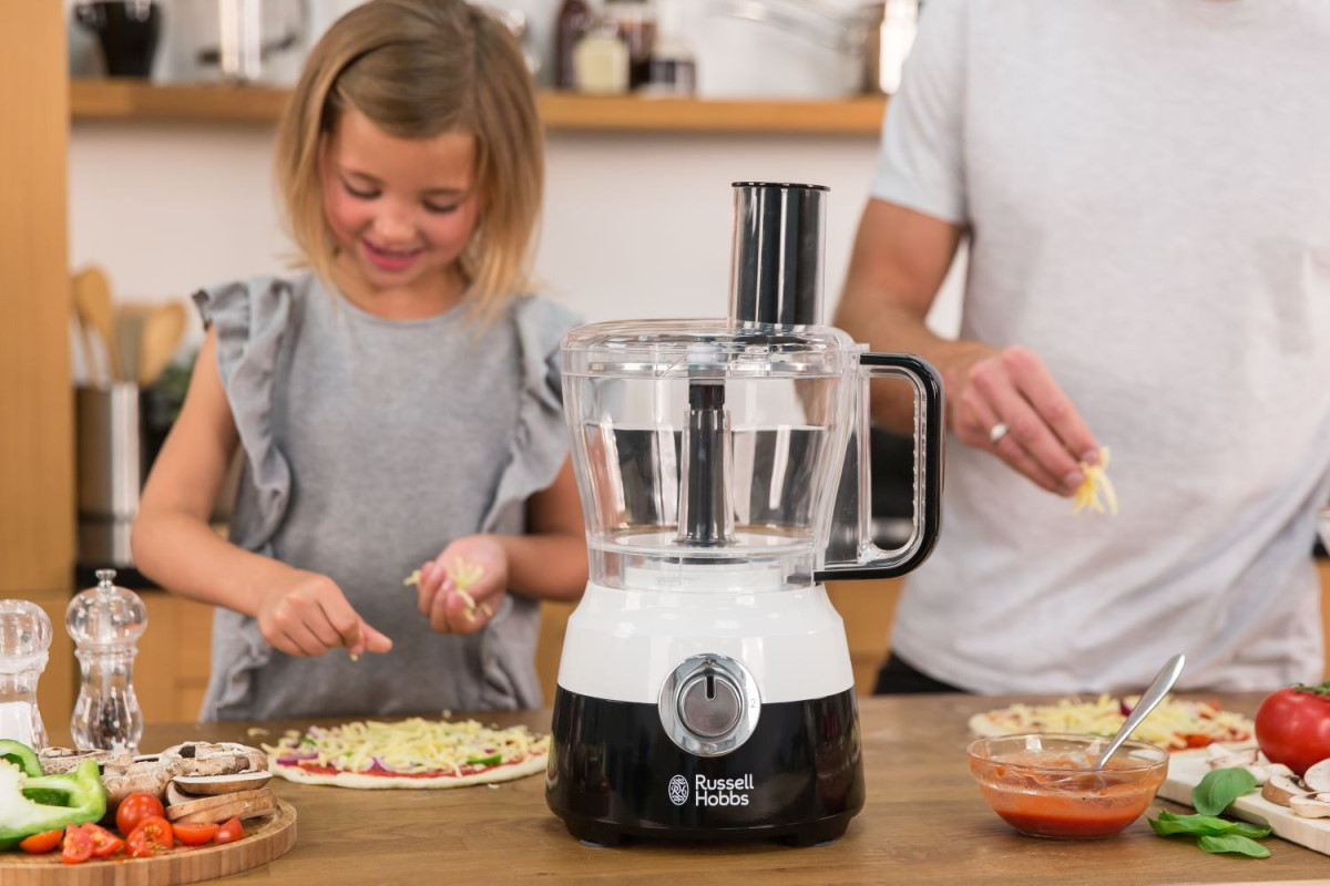 Недорогая модель Russell Hobbs Horizon 24731-56 имеет сразу две чаши объемом по 1.5 л. Одна предназначена для использования в качестве блендера и приготовления различных напитков, детских пюре и дробления льда, другая — основная, в которой можно измельчать, нарезать и перемешивать продукты. То есть одна машина выполняет роль нескольких устройств, и хоть сама она и малогабаритная, придется выделить место на кухне для чаш и разных насадок.