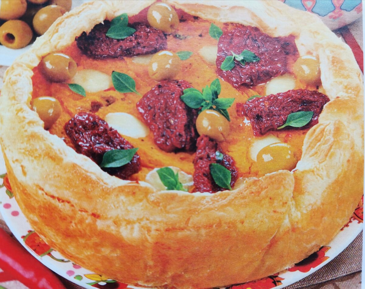 Тыкву запечь сначала в духовке, затем сделать пюре. Форму диаметром 26-28 см обдать холодной водой. Слоеное тесто раскатать и выложить в форму, сделав высокий бортик. Перец чили, удалив семена измельчить. Половину помидоров мелко нарезать. Для начинки яйца смешать со сливками, тыквенным пюре и оливковым маслом. Добавить тертый сыр, кукурузную муку, перец чили, нарезанные помидоры и лимонную цедру. Приправить солью, черным перцем и паприкой. Начинку выложить на тесто и разровнять. Сверху разложить кусочки сыра. Выпекать 40 минут при температуре 190 градусов. Пирог украсить сушеными помидорами, оливками и зеленью.