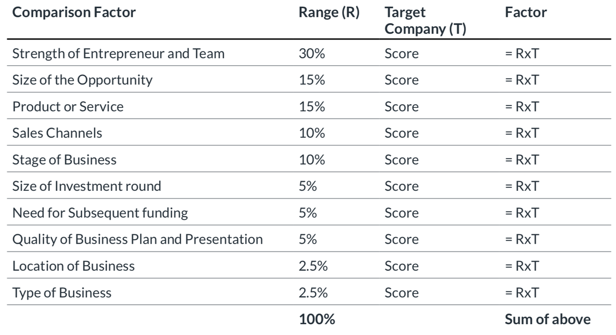 Данный метод учитывает гораздо больше факторов риска, чтобы определить доинвестиционную оценку (pre-money) для стартапов на ранней стадии. Этот метод может использоваться как первый этап в оценке потенциальных рисков и должен обязательно использоваться совместно с другим методом оценки стартапов. Большинство отраслевых аналитиков выделяют следующие факторы, на основании которых проводится оценка: