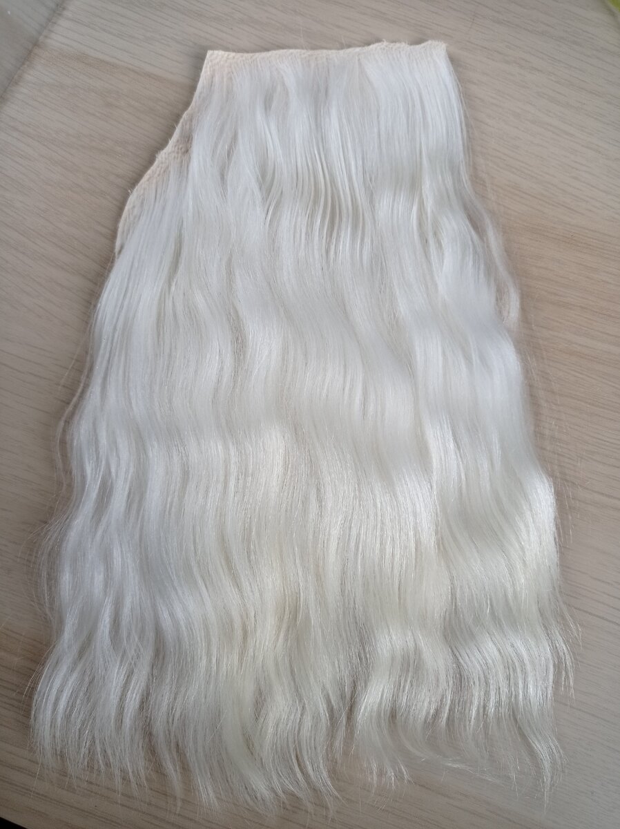 Первое фото шкурки до окраски. Цвет волоса белый с совсем небольшой желтизной. Все шкурки до окраски я не фотографировала, но начальный цвет всегда такой. Отличаться локоны будут только длиной и величиной завитка - некоторые только слегка волнистые, другие покучерявее.