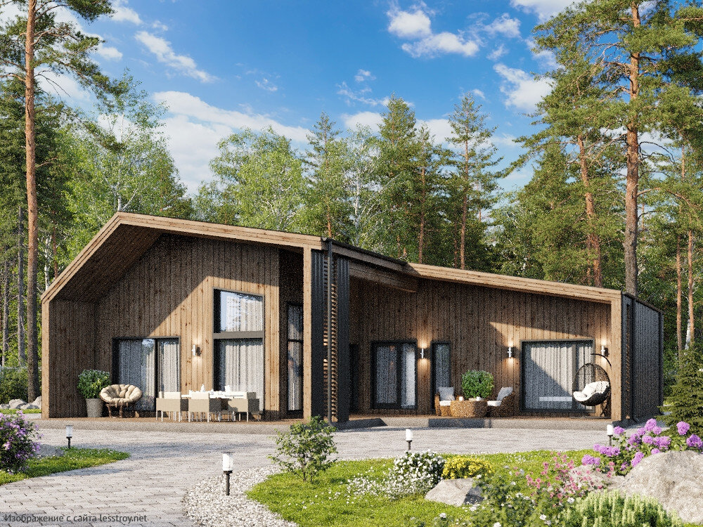 Вот такой интересный проект дома есть на портале Лесстрой. Это наверное самый яркий образец амбарного стиля. Дом выглядит интересно, хоть и откровенно грубовато. Хотя, конечно, это на любителя. Большие окна немного сглаживают впечатление, и терраса со столиками выглядит уютно, однако все же дом больше напоминает складское строение.