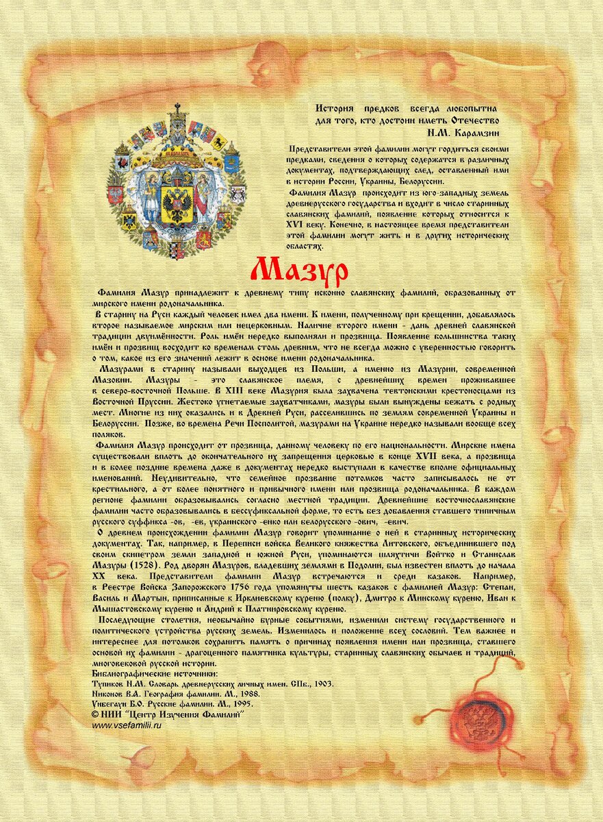 Фамилия Мазур принадлежит к древнему типу исконно славянских фамилий, образованных от мирского имени родоначальника.