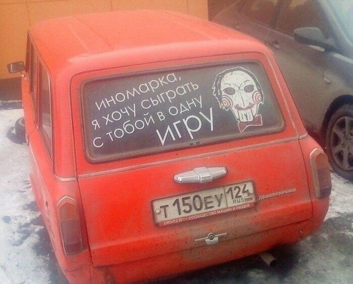 Надпись на заднем стекле гласит: «Иномарка, я хочу сыграть с тобой в одну игру».