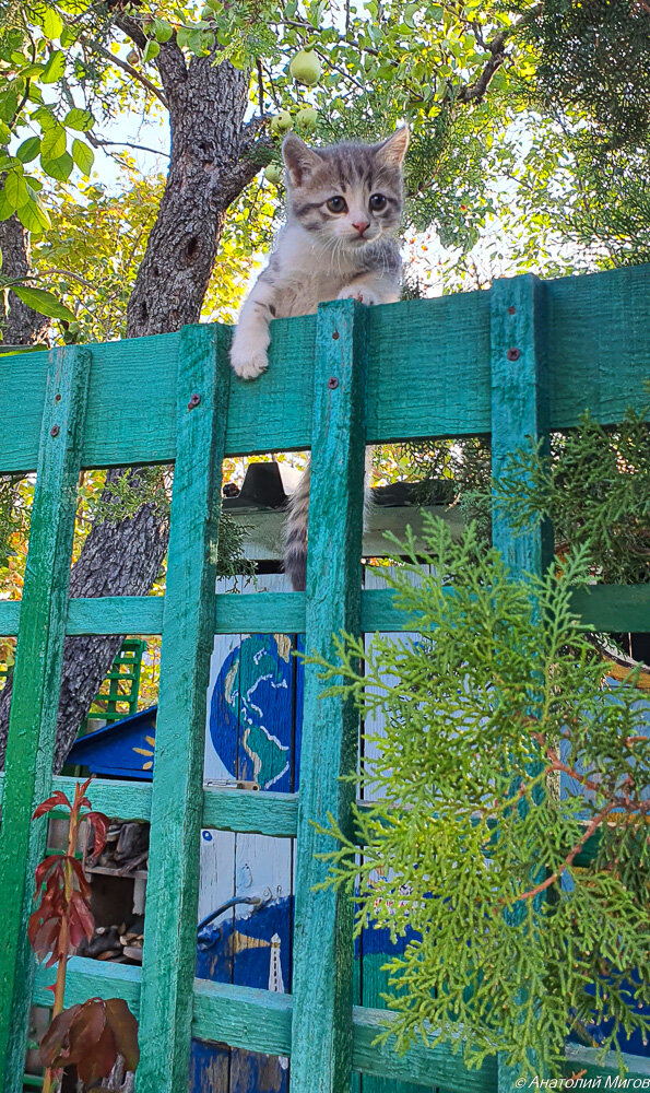 Котенок Сева забрался на самый верх садовой шпалеры. А там почти два с половиной метра. Гордый такой. Бродит туда-сюда, свысока посматривает на Коктебельчика.