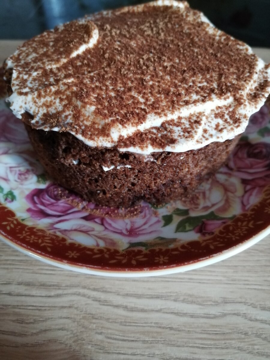 В подходящую для смешивания посуду кладем яйцо, молоко (1 ст.л) и растопленное, но не очень горячее сливочное масло (26 гр.). Туда же отправляем столовую ложку кокосовой муки и столько же какао порошка. Добавляем сахарозаменитель по вкусу и щепотку разрыхлителя. Все тщательно смешиваем миксером (не насадкой для блендера) и ставим в микроволновку на пару мину. При желании порцию можно увеличить вдвое и поставить на 4 минуты. Затем достаем, остужаем, разрезаем пополам, или на сколько вам угодно частей, и смазываем кремом. У меня обычная сметана с сах. замом и сверху посыпала какао.