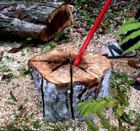 Разумеется, что механически корчевать пень мне не по силам, поэтому я научилась выжигать его или использовать химические средства. Если пень сухой и старый, то наливаю в его трещины немного жидкости для розжига углей, заталкиваю туда же бумагу и поджигаю.