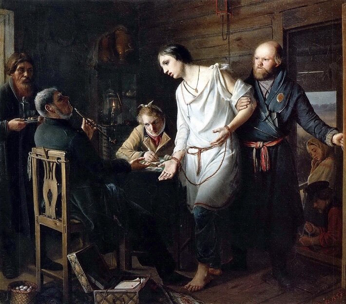 Перед вами жанровая картина Василия Перова, не утратившая свою актуальность и по сей день. Называется "Приезд станового на следствие".