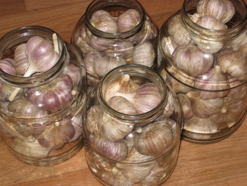 Чеснок убран, высушен, очищен, а дальше что? Я хранила чеснок по разному в коробках, в ящиках, но ближе к весне почти весь чеснок высыхал, хотя головки с виду были нормальные. А однажды в интернете нашла совет о хранении чеснока в стеклянной банке. Банки специально не подвергала тепловой обработке, а просто брала чистую и сухую трехлитровую банку. Чеснок, уложенный в банке. хранила в разных