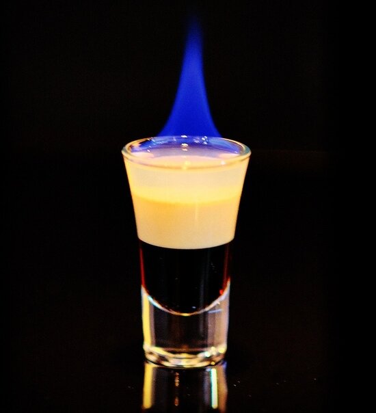 В термостойкую рюмку влить Калуа, затем акуратно влить Бейлис (что бы не нарушить слои можно использовать ложку, вливая на обратную сторону холодной ложки, затем влить куантро таким же методом. При подаче, поджечь.
