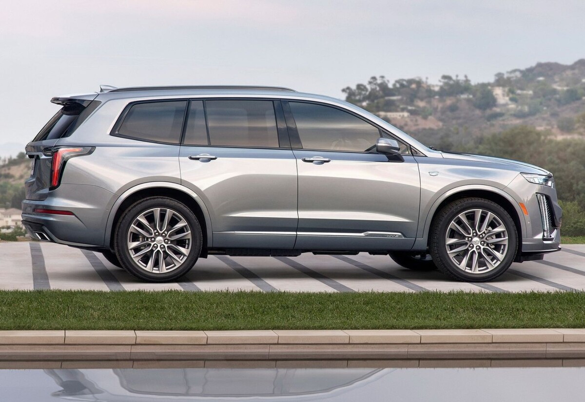 В профиль автомобиль выделяется строгими линиями, вздернутой подоконной линией в районе задних стоек, что навевает ассоциации с моделью Вольво XC90, хромированной накладкой по низу дверей, окрашенными под цвет кузова порогами и надкрылками, а также небольшими треугольничками в передних стеклах. Корма нового Кадиллак Икс Ти 6 обращает на себя внимание спойлером над пятой дверью, вертикальными Г-образными фонарями, секции которых заходят одновременно и на крышку багажника, и на крылья, тонкой хромированной накладкой на всю ширину машины, а также двумя ромбовидными патрубками выпускной системы.