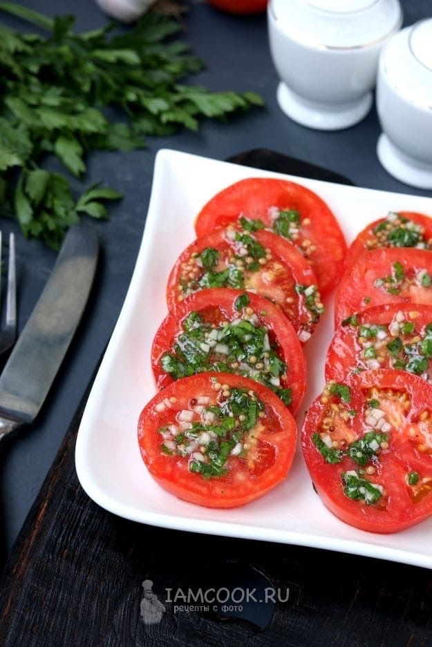 Томаты (лучше разных цветов) 5 шт Чеснок 3-4 зубчика Соль 0.5 ложки Сахар 0.5 ложки Горчица зернистая 1 ч.л Уксус яблочный 6% 1 ст л Оливковое масло 3 ст л Перец чёрный по вкусу Зелень горсть