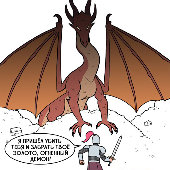 Сказки и легенды об огромных огнедышащих драконах являются одними из самых популярных и захватывающих во многих странах мира! А там, где есть драконы, всегда есть и прекрасные принцессы, горы золота и отважные рыцари, готовые сразиться с драконом и забрать свою награду! Но о стандартных путях развития такой истории вы уже наверняка слышали в различных сказках и мультфильмах - рыцарь побеждает злого дракона, спасает принцессу, забирают деньги, и все (кроме дракона) живут долго и счастливо. Популярный и очень талантливый художник Бенджамин Хед, который известен всему Интернету своей серией комиксов "Пикси и Брут", время от времени любит развлекать себя и своих подписчиков необычными и очень весёлыми комиксами, которые рассказывают знакомую историю с добавлением юмора и капельки абсурда! Мы уже видели мини-комиксы Бена на тему рыбалки с точки зрения рыб, рассуждения о том, кто на самом деле должен носить титул "царя зверей", а также необычную историю о повзрослевшей Даше-путешественнице.