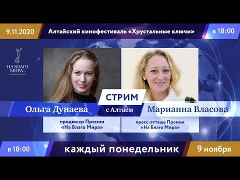 Продюсер Ольга Дунаева и пресс-атташе Премии «На Благо Мира» Марианна Власова отправились на Алтай в город-курорт Белокуриха на кинофестиваль «Хрустальные ключи». В рамках фестиваля Премия «На Благо Мира» вручит специальные призы в трёх номинациях — «Кинематограф», «Анимация. Полный метр» и «Анимация. Короткий метр». В стриме речь пойдет о детском, семейном кино, его значение и роли
