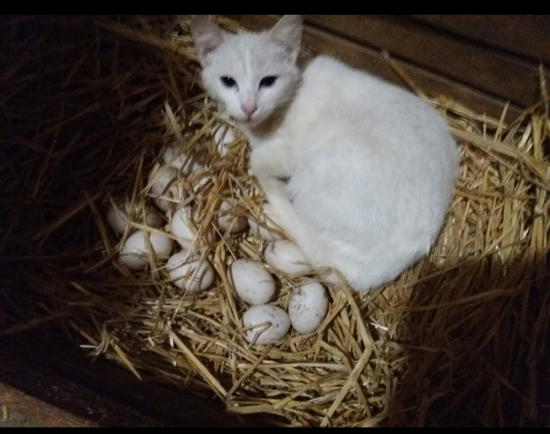 Кошка обнаружила в гараже то, что по её мнению, на данный момент нуждалось в защите и опеке более всего на свете – куриные яйца, купленные нами на днях для инкубатора.