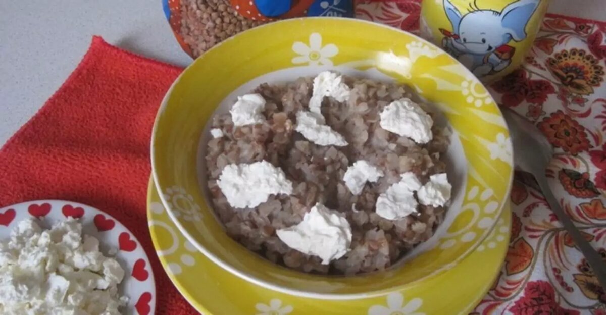 - Сверху творога кладем гречневую кашу, заправленную перед подачей маслом.