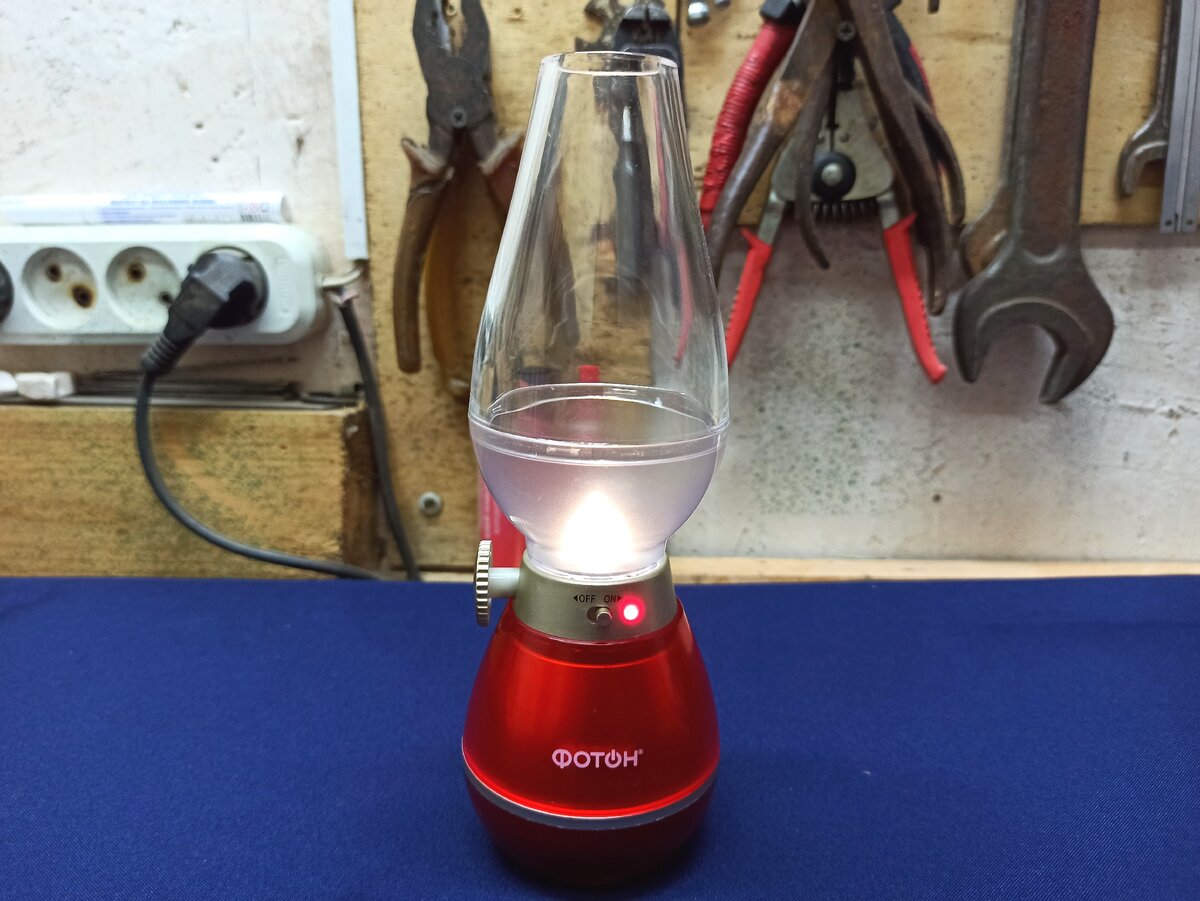 Как можно заметить из видеоролика, яркость свечения светодиодов можно регулировать с помощью реостата, который расположен сбоку корпуса. Со стороны кажется, что внутри горит огонёк, так как отражатель выполнен в форме огня, а цвет светодиодов — тёплый.