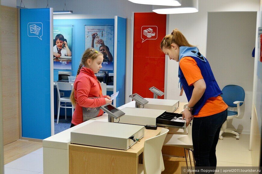 В банке ВТБ24 дети получают стартовую сумму денег, а также, устроившись на работу, могут научиться отличать фальшивые купюры от настоящих, правильно работать с клиентами, работать с пломбиратором и инкассаторским мешком, работать со счётными машинами, работать с детектором валют, выдавать деньги по сертификатам и квитанциям, охранять банк и сопровождать инкассацию.