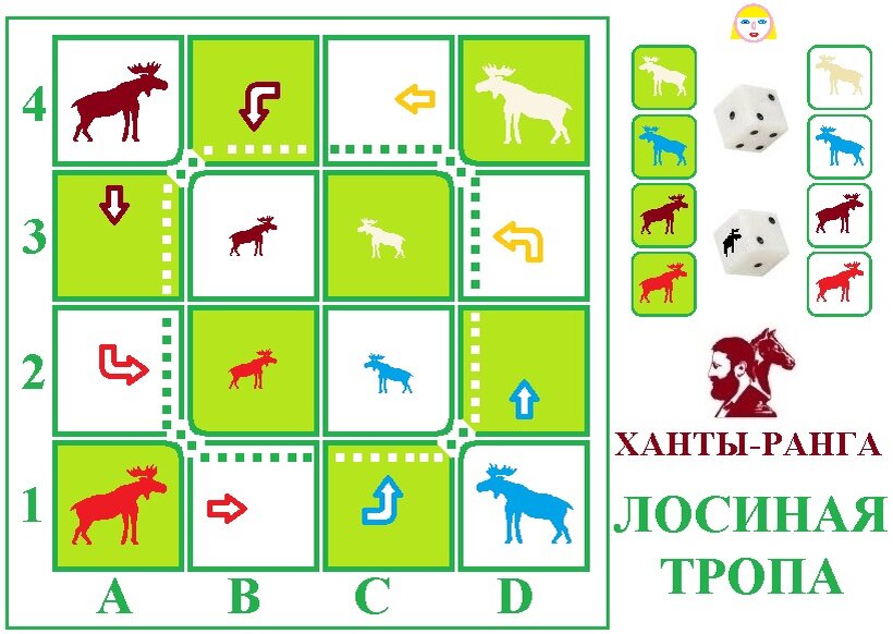 У каждого игрока по четыре фишки плоских двусторонних – на одной стороне лось своего цвета на белом фоне, на другой стороне – на зелёном фоне.